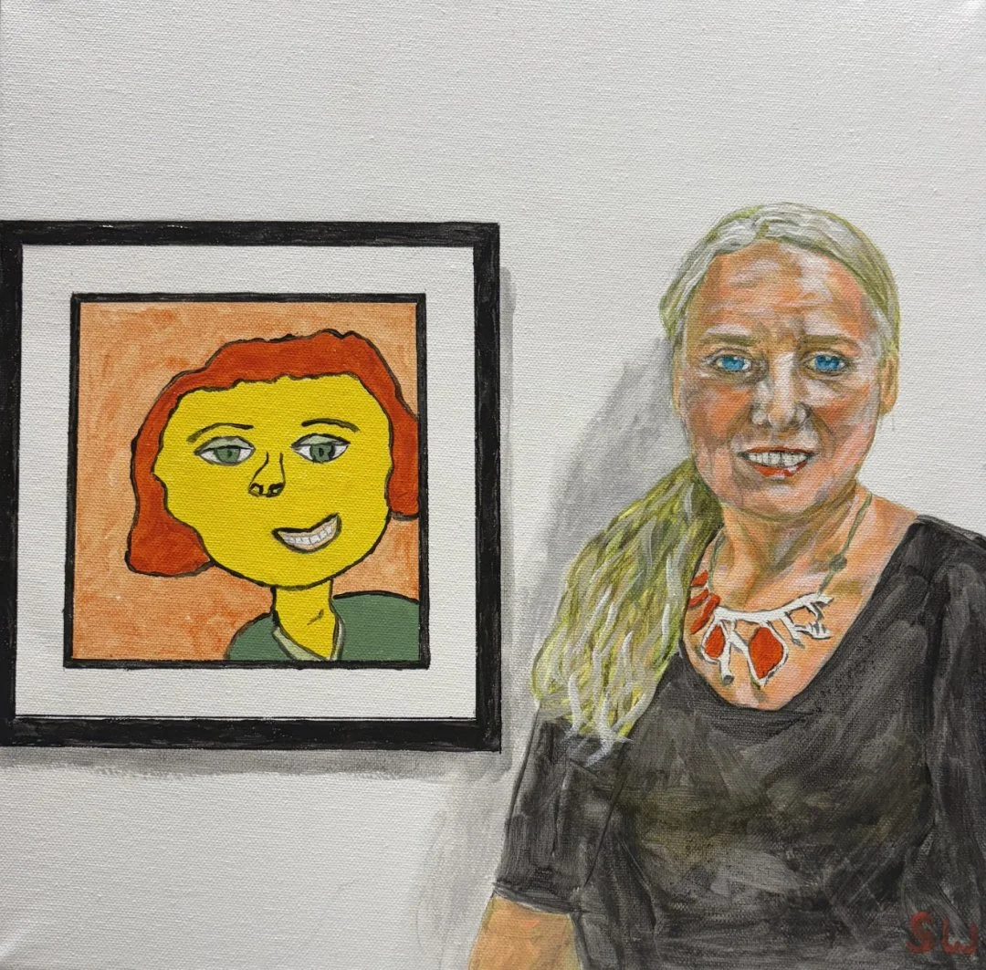 I look at You Look at Me represents my belief that art making is a child’s first ‘literacy’ which opens doors to other forms of literacy. A photo was taken of me standing next to a young girl’s painting. The secondary colours featured in the girl’s self-portrait are mirrored in my portrait of me.